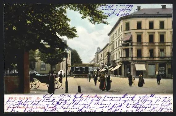 AK Freiburg i. Br., Strassenbahn in der Friedrichstrasse