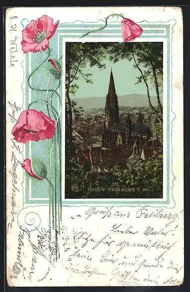 AK Freiburg i. Br., Teilansicht mit Kirche, Mohnblumen, Passepartout