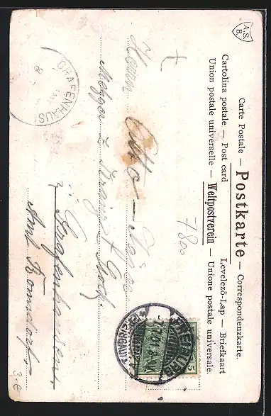 alte Ansichtskarte, gelaufen 1901, Eckknicke li. unten u. re. oben, minimale Einrisse li. unten u. re. oben, Abriebspur li. unten, guter Zustand