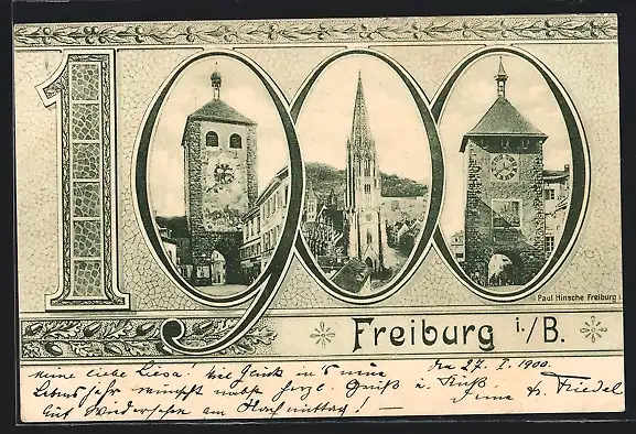 AK Freiburg i. Br., Türme im Passepartout zum Neujahr 1900