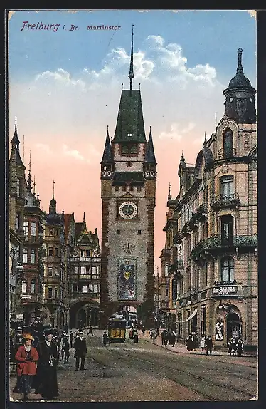 AK Freiburg i.B., Passanten steigen in die Strassenbahn am Martinstor