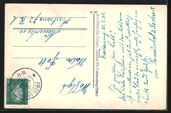 Personenbezogene Daten auf der Rückseite der Karte wurden durch blauen Textmarker unkenntlich gemacht. Die blauen Stellen sind auf die Vorderseite durchgeweicht und wirken sich negativ auf das Postkartenfoto aus