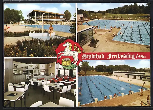 AK Freilassing /Obb., Stadtbad mit Terrassencafe W. Höpfler, Wappen