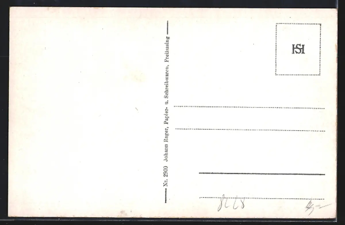 Personenbezogene Daten auf der Rückseite der Karte wurden durch blauen Textmarker unkenntlich gemacht. Die blauen Stellen sind auf die Vorderseite durchgeweicht und wirken sich negativ auf das Postkartenfoto aus