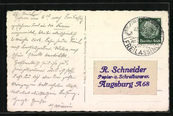 Personenbezogene Daten auf der Rückseite der Karte wurden durch blauen Textmarker unkenntlich gemacht. Die blauen Stellen sind auf die Vorderseite durchgeweicht und wirken sich negativ auf das Postkartenfoto aus