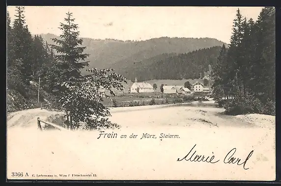 AK Frein an der Mürz, Blick zum Ort hinüber vom Weg aus