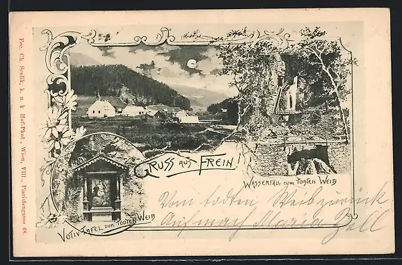 AK Frein bei Mürzsteg, Ortsansicht, Votiv-Tafel zum Todten Weib