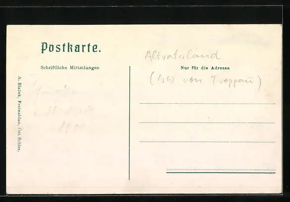 Personenbezogene Daten auf der Rückseite der Karte wurden durch blauen Textmarker unkenntlich gemacht. Die blauen Stellen sind auf die Vorderseite durchgeweicht und wirken sich negativ auf das Postkartenfoto aus