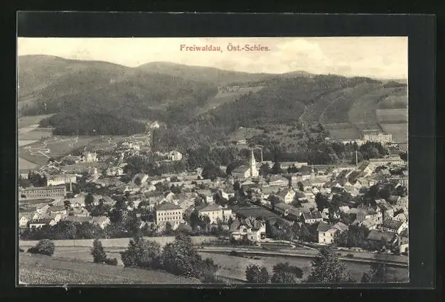 AK Freiwaldau, Eisenbahnschienen am Rande des Ortes