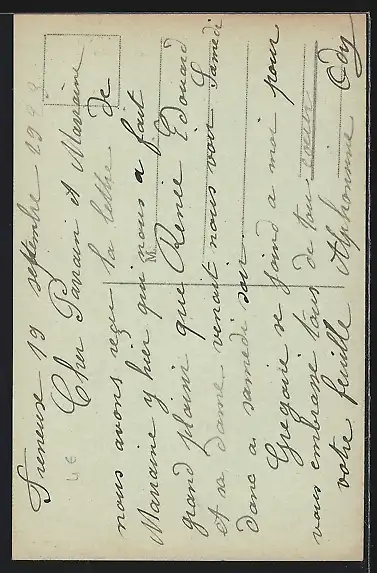 Personenbezogene Daten auf der Rückseite der Karte wurden durch blauen Textmarker unkenntlich gemacht. Die blauen Stellen sind auf die Vorderseite durchgeweicht und wirken sich negativ auf das Postkartenfoto aus