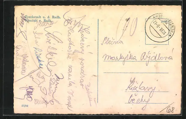 Personenbezogene Daten auf der Rückseite der Karte wurden durch blauen Textmarker unkenntlich gemacht. Die blauen Stellen sind auf die Vorderseite durchgeweicht und wirken sich negativ auf das Postkartenfoto aus
