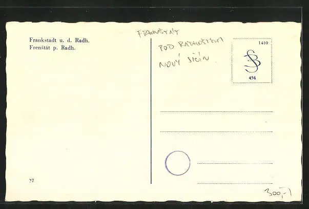 Personenbezogene Daten auf der Rückseite der Karte wurden durch blauen Textmarker unkenntlich gemacht. Die blauen Stellen sind auf die Vorderseite durchgeweicht und wirken sich negativ auf das Postkartenfoto aus