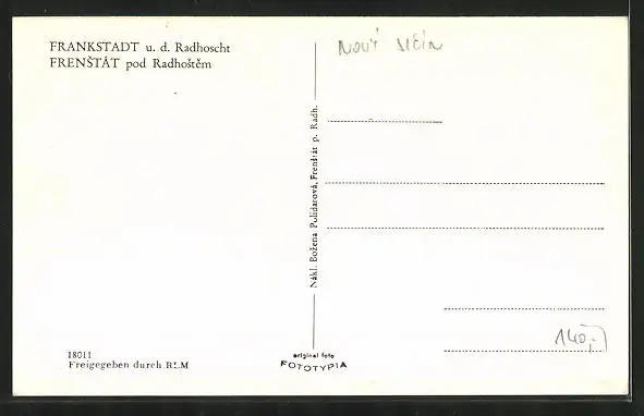 AK Frenstat pod Radhostem, Strassenpartie mit Drogerie und Denkmal