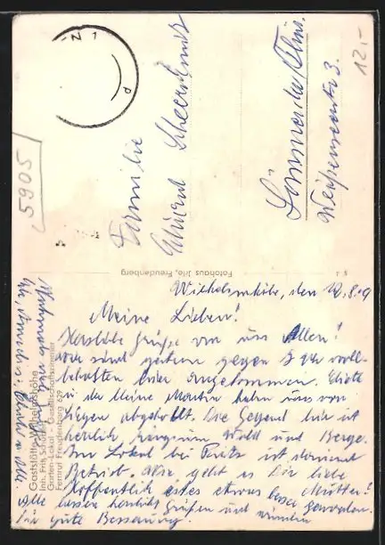 Personenbezogene Daten auf der Rückseite der Karte wurden durch blauen Textmarker unkenntlich gemacht. Die blauen Stellen sind auf die Vorderseite durchgeweicht und wirken sich negativ auf das Postkartenfoto aus