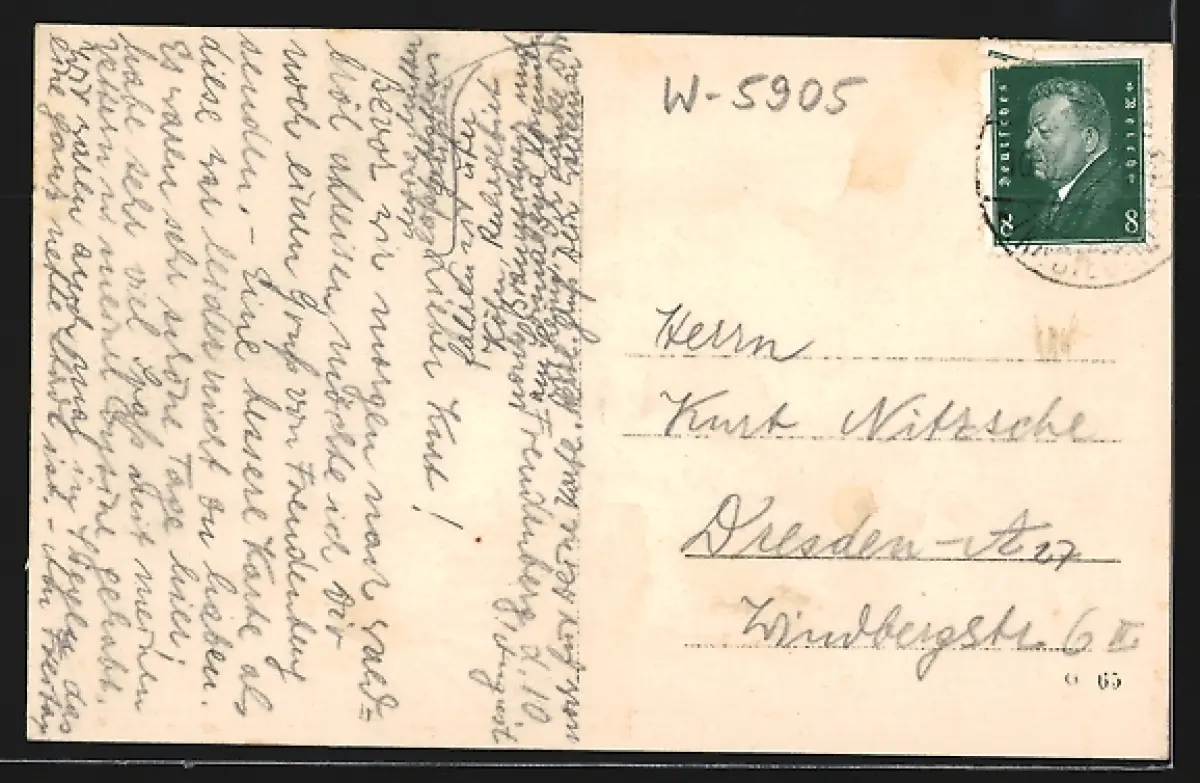 Personenbezogene Daten auf der Rückseite der Karte wurden durch blauen Textmarker unkenntlich gemacht. Die blauen Stellen sind auf die Vorderseite durchgeweicht und wirken sich negativ auf das Postkartenfoto aus