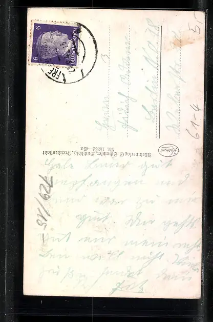 Personenbezogene Daten auf der Rückseite der Karte wurden durch blauen Textmarker unkenntlich gemacht. Die blauen Stellen sind auf die Vorderseite durchgeweicht und wirken sich negativ auf das Postkartenfoto aus