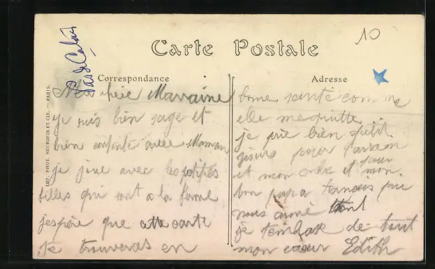 Personenbezogene Daten auf der Rückseite der Karte wurden durch blauen Textmarker unkenntlich gemacht. Die blauen Stellen sind auf die Vorderseite durchgeweicht und wirken sich negativ auf das Postkartenfoto aus