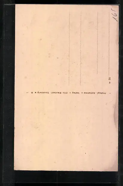 Personenbezogene Daten auf der Rückseite der Karte wurden durch blauen Textmarker unkenntlich gemacht. Die blauen Stellen sind auf die Vorderseite durchgeweicht und wirken sich negativ auf das Postkartenfoto aus