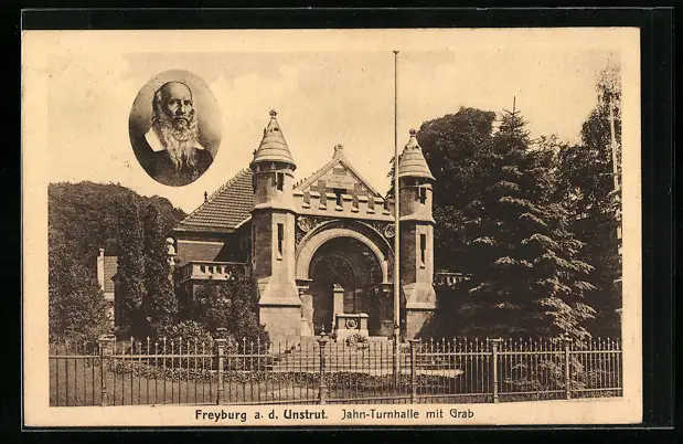 AK Freyburg a. d. Unstrut, Jahn-Turnhalle mit Grab, Porträt Turnvater Jahn