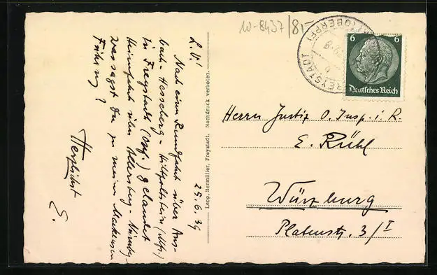 Personenbezogene Daten auf der Rückseite der Karte wurden durch blauen Textmarker unkenntlich gemacht. Die blauen Stellen sind auf die Vorderseite durchgeweicht und wirken sich negativ auf das Postkartenfoto aus