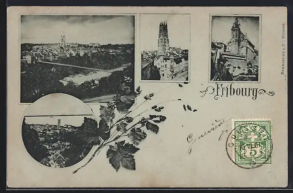 AK Fribourg, Stadtpanorama, Kirche und Rathaus