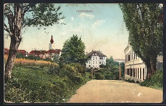 AK Friedberg, Strassenpartie mit Blick auf Häuser und Kirche