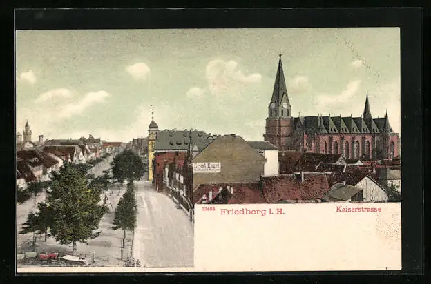 AK Friedberg i. H., Kaiserstrasse mit Kirche aus der Vogelschau