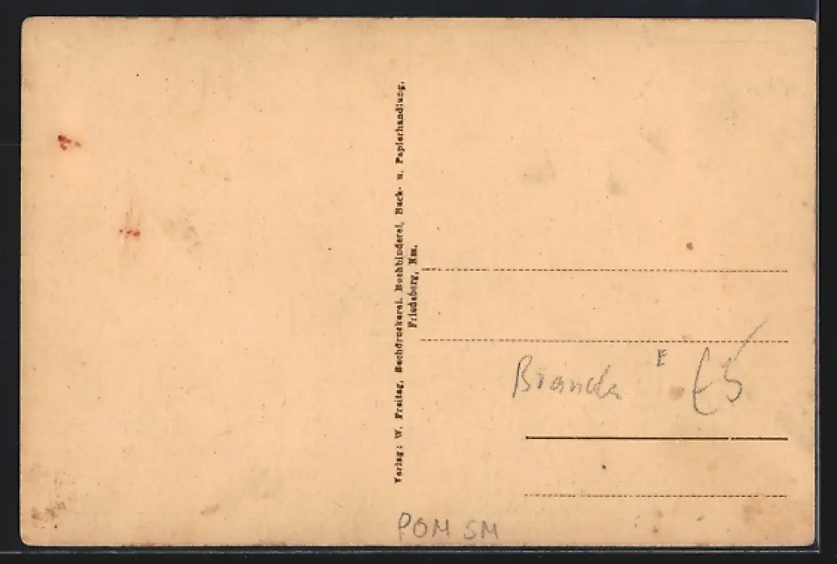 Personenbezogene Daten auf der Rückseite der Karte wurden durch blauen Textmarker unkenntlich gemacht. Die blauen Stellen sind auf die Vorderseite durchgeweicht und wirken sich negativ auf das Postkartenfoto aus