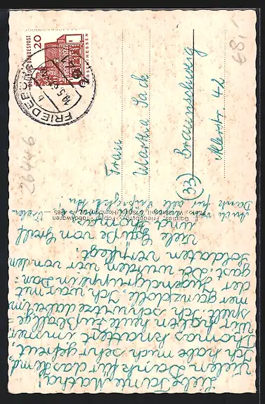 Personenbezogene Daten auf der Rückseite der Karte wurden durch blauen Textmarker unkenntlich gemacht. Die blauen Stellen sind auf die Vorderseite durchgeweicht und wirken sich negativ auf das Postkartenfoto aus