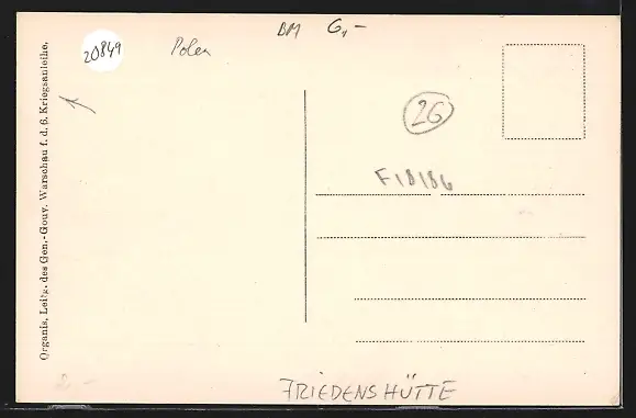 Personenbezogene Daten auf der Rückseite der Karte wurden durch blauen Textmarker unkenntlich gemacht. Die blauen Stellen sind auf die Vorderseite durchgeweicht und wirken sich negativ auf das Postkartenfoto aus