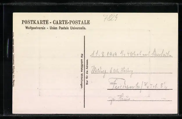 Personenbezogene Daten auf der Rückseite der Karte wurden durch blauen Textmarker unkenntlich gemacht. Die blauen Stellen sind auf die Vorderseite durchgeweicht und wirken sich negativ auf das Postkartenfoto aus