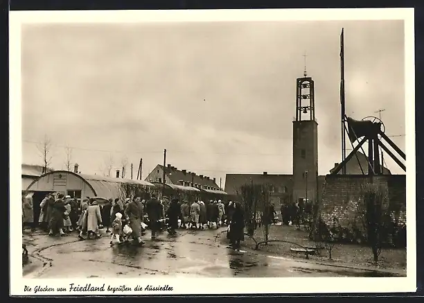 AK Friedland / Leine, Aussiedler / Flüchtlinge beim Glockenturm