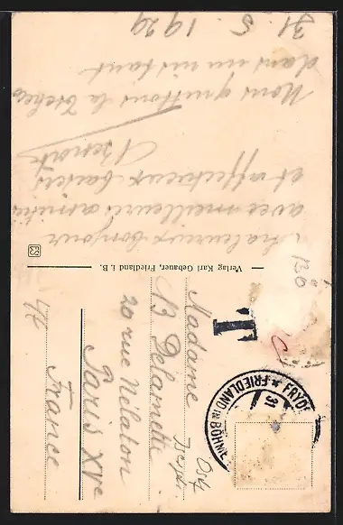 Personenbezogene Daten auf der Rückseite der Karte wurden durch blauen Textmarker unkenntlich gemacht. Die blauen Stellen sind auf die Vorderseite durchgeweicht und wirken sich negativ auf das Postkartenfoto aus