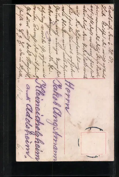 Personenbezogene Daten auf der Rückseite der Karte wurden durch blauen Textmarker unkenntlich gemacht. Die blauen Stellen sind auf die Vorderseite durchgeweicht und wirken sich negativ auf das Postkartenfoto aus