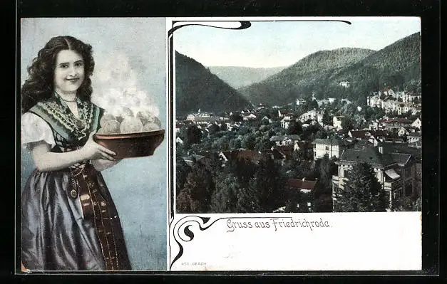 AK Friedrichroda, Ortsansicht, Frau in Tracht mit Klössen