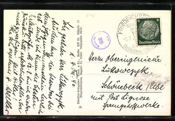 Personenbezogene Daten auf der Rückseite der Karte wurden durch blauen Textmarker unkenntlich gemacht. Die blauen Stellen sind auf die Vorderseite durchgeweicht und wirken sich negativ auf das Postkartenfoto aus