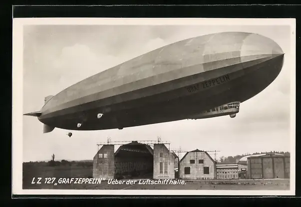 AK Friedrichshafen, Graf Zeppelin LZ 127 über den Luftschiffhallen