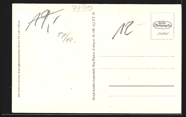 Personenbezogene Daten auf der Rückseite der Karte wurden durch blauen Textmarker unkenntlich gemacht. Die blauen Stellen sind auf die Vorderseite durchgeweicht und wirken sich negativ auf das Postkartenfoto aus