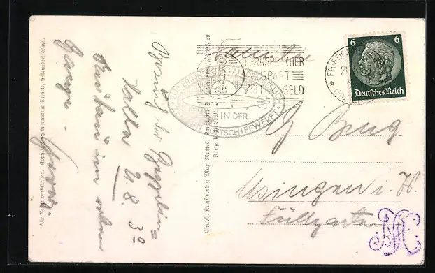 Personenbezogene Daten auf der Rückseite der Karte wurden durch blauen Textmarker unkenntlich gemacht. Die blauen Stellen sind auf die Vorderseite durchgeweicht und wirken sich negativ auf das Postkartenfoto aus