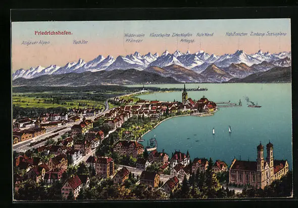 AK Friedrichshafen, Totalansicht mit Gebirgskette aus der Vogelschau