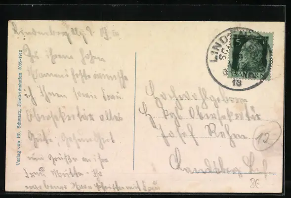 Personenbezogene Daten auf der Rückseite der Karte wurden durch blauen Textmarker unkenntlich gemacht. Die blauen Stellen sind auf die Vorderseite durchgeweicht und wirken sich negativ auf das Postkartenfoto aus