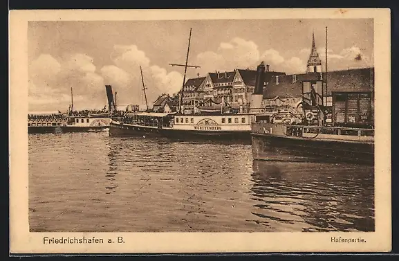 AK Friedrichshafen a. B., Hafenpartie mit Dampfern
