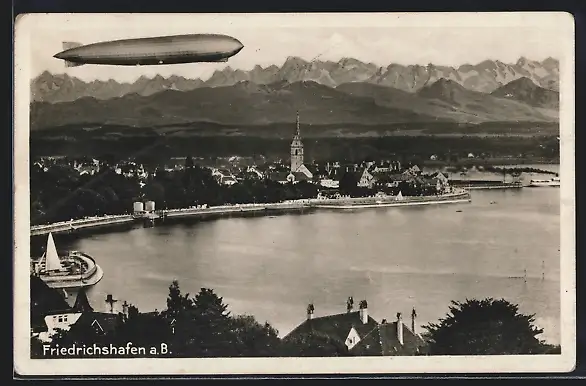 AK Friedrichshafen a. B., Teilansicht mit Zeppelin in der Luft