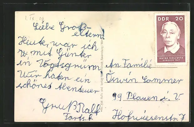 Personenbezogene Daten auf der Rückseite der Karte wurden durch blauen Textmarker unkenntlich gemacht. Die blauen Stellen sind auf die Vorderseite durchgeweicht und wirken sich negativ auf das Postkartenfoto aus