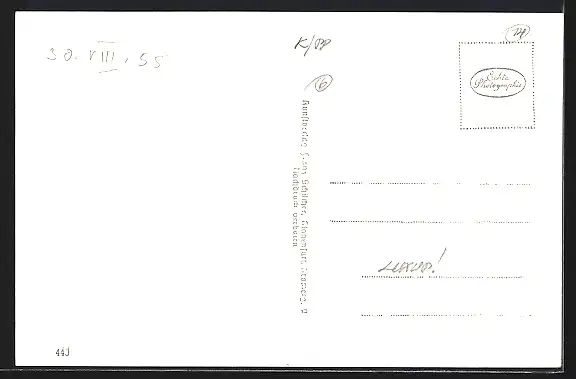 Personenbezogene Daten auf der Rückseite der Karte wurden durch blauen Textmarker unkenntlich gemacht. Die blauen Stellen sind auf die Vorderseite durchgeweicht und wirken sich negativ auf das Postkartenfoto aus