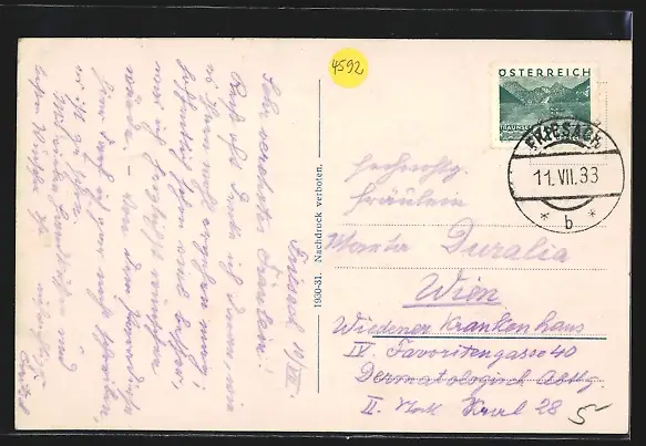 gelaufen 1933, rückseitig Klebe- und Papierreste, guter Zustand