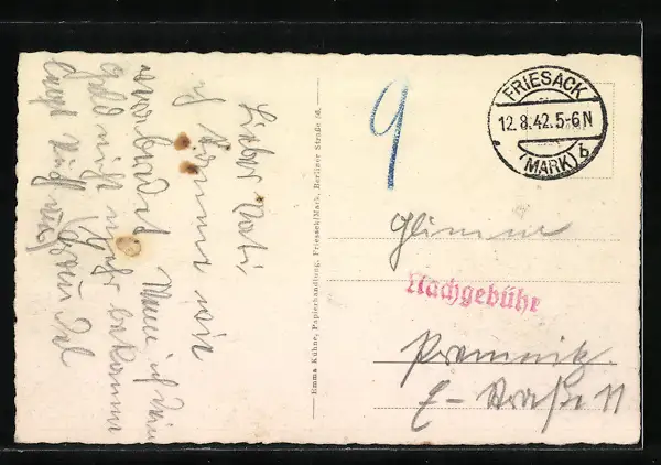 Personenbezogene Daten auf der Rückseite der Karte wurden durch blauen Textmarker unkenntlich gemacht. Die blauen Stellen sind auf die Vorderseite durchgeweicht und wirken sich negativ auf das Postkartenfoto aus