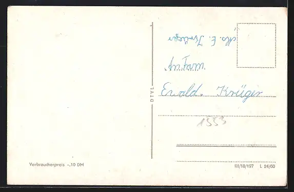 Personenbezogene Daten auf der Rückseite der Karte wurden durch blauen Textmarker unkenntlich gemacht. Die blauen Stellen sind auf die Vorderseite durchgeweicht und wirken sich negativ auf das Postkartenfoto aus