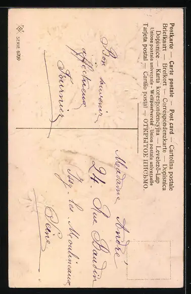 Personenbezogene Daten auf der Rückseite der Karte wurden durch blauen Textmarker unkenntlich gemacht. Die blauen Stellen sind auf die Vorderseite durchgeweicht und wirken sich negativ auf das Postkartenfoto aus