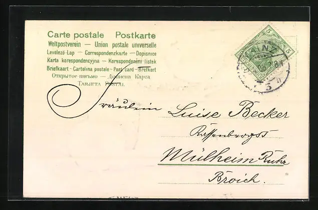 Personenbezogene Daten auf der Rückseite der Karte wurden durch blauen Textmarker unkenntlich gemacht. Die blauen Stellen sind auf die Vorderseite durchgeweicht und wirken sich negativ auf das Postkartenfoto aus